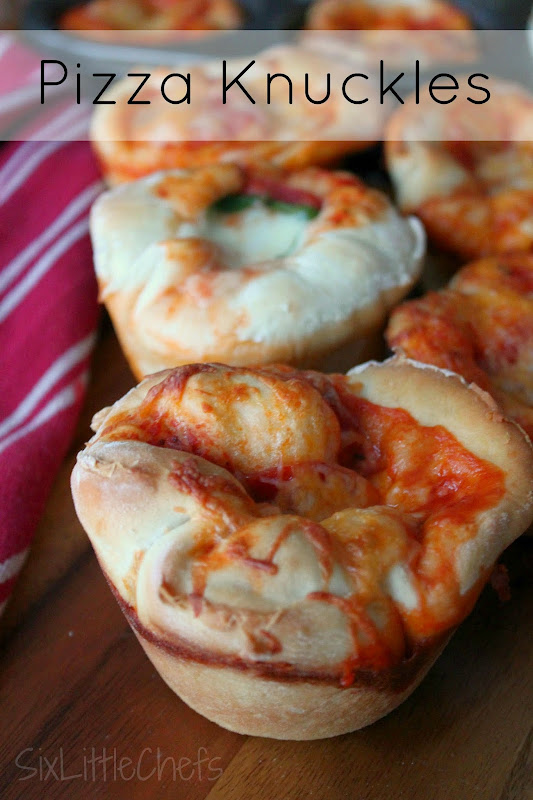 I found this fun pizza variation to mix up our weekly pizza night and they were most definitely a hit! These pizza knuckles bring the wonderful taste of pizza into an easy-to-hold muffin cup. They are inspired by an appetizer served at Delia's, a restaurant in Northern Virginia. I've never been to Northern Virginia but, thanks to the internet, they've made their way into our kitchen here in Michigan. I use a jumbo muffin tin to make dinner sized servings, but you can use a regular, or even mini sized muffin tin to turn them into a cute little, fabulous appetizer. Keep the toppings simple. If you get too many, they crust will be kind of soggy. In addition to the pepperoni recipe below, I like to make a tomato basil version. After putting a spoonful of sauce in the crust, top with a few thinly sliced tomato pieces, fresh basil and a cube of fresh mozzarella. That's my favorite but most of my kiddos prefer the pepperoni version. With these Pizza Knuckles, everybody can have their favorite!